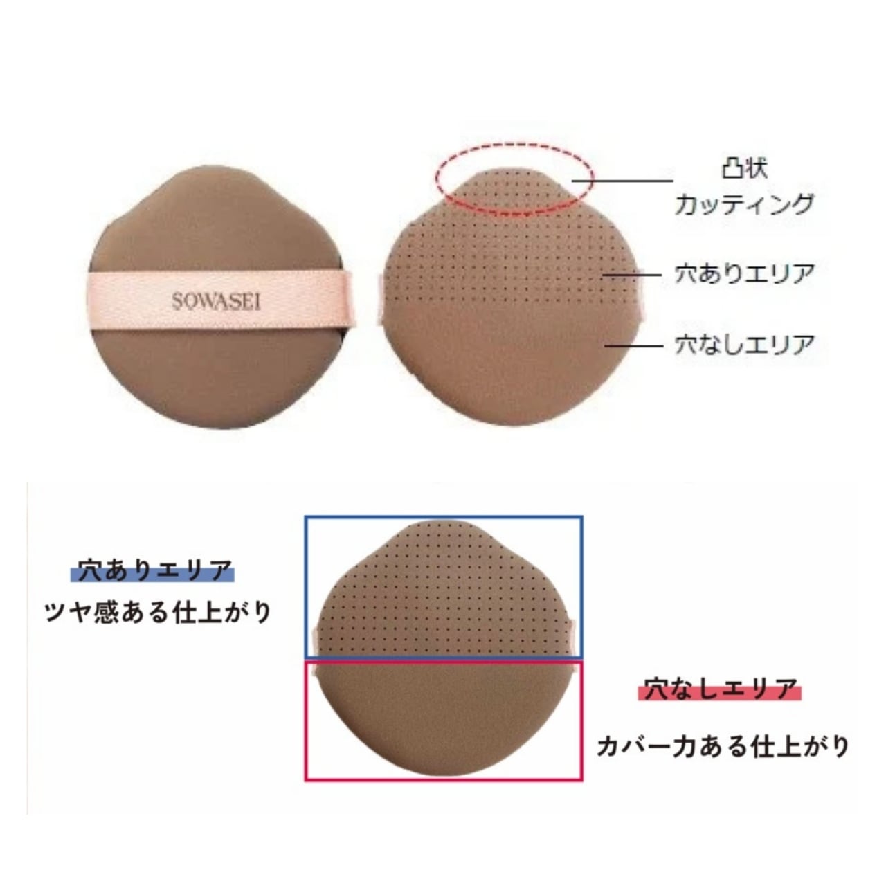 目元や小鼻にフィットして塗りやすい、凸状カッティングを施した独自形状のふかふかのパフ。薄づきで肌にツヤ感を与える「穴ありエリア」と、カバー力ある仕上がりの「穴なしエリア」の2WAY。ポンポンと塗布すれば、カバー力とツヤ感を両立した仕上がりに。